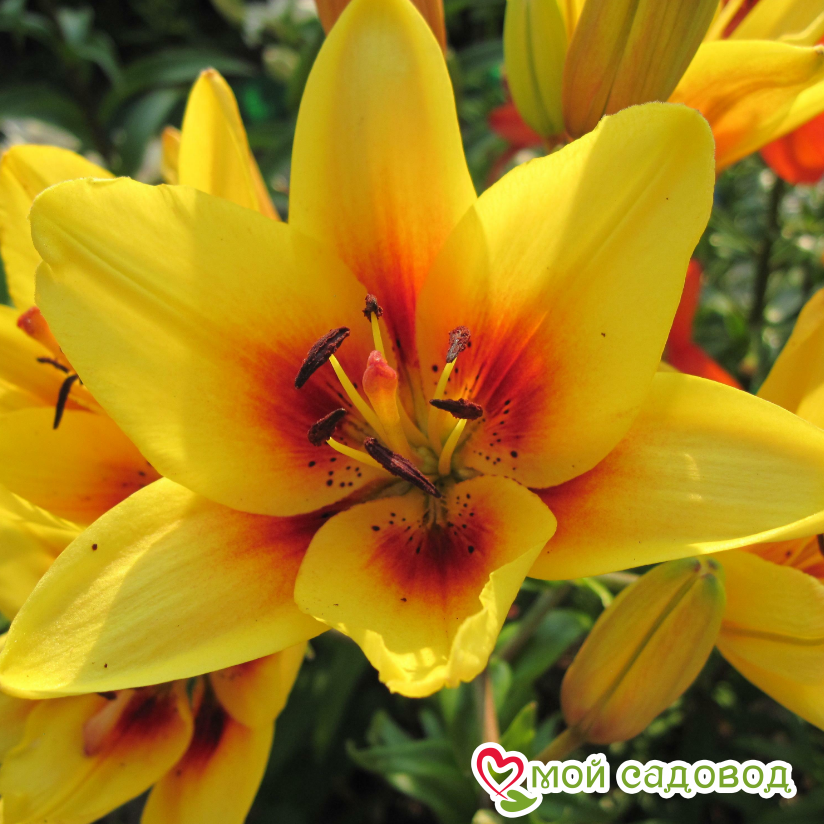 Оригинальная лилия с ее необычной окраской станет предметом восхищения гостей и соседей. Цветет этот сорт в середине июля. На стебле образуется до 7 цветков направленных вверх. Лепестки среднего размера, желтые, с красно-коричневым основанием и пыльниками, не отгибаются. Очаровательная лилия необычайно хороша в срезке. Высаживать Grand Cru (Гранд Крю) на клумбе лучше среди многолетников с желтыми или синими цветками. Посадка лилии: Глубина посадки лилии зависит от почвы. Если почва легкая – можно углубить на 12-13 см, что составляет 3-4 диаметра луковицы. Если же почва глинистая или тяжелая, достаточно двух диаметров, глубина лунки не более 5 см. В выкопанную ямку насыпьте слой песка, установите луковицу донышком на песок, присыпьте сверху остатками грунта, сверху замульчируйте. Уход за лилией: Пышных бутонов у лилий можно добиться, соблюдая обычные правила ухода: в первый год лилиям не нужна весенняя подкормка, удобрения вносятся разово за сезон, после цветения. Но это лишь в том случае, если перед посадкой вносилось удобрение. Перед началом цветения высокорослые сорта рекомендуется подвязать. После цветения засохшие бутоны удаляют. Полив умеренный: лучше не долить, чем перелить. Если цветок начал чахнуть и имеются подозрения на перелив – смешайте по столовой ложке речного песка и древесной золы, высыпьте под цветок и не поливайте ближайшую неделю. Полив лилии важно проводить под корень, старайтесь исключить попадание воды на листья, это провоцирует ожоги на солнце и распространение грибковых заболеваний.