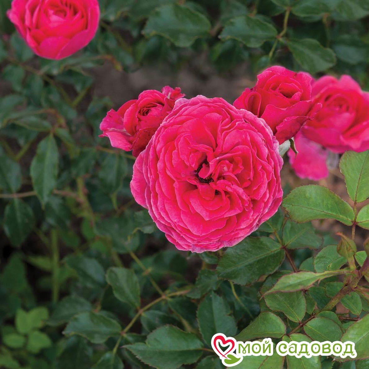 Цветки диаметром 6-7 см, махровые, тёмно-розовые со смешанными светло-сиреневыми и карминовыми оттенками, собраны в плотные соцветия, благодаря чему эта роза имеет вид букета.